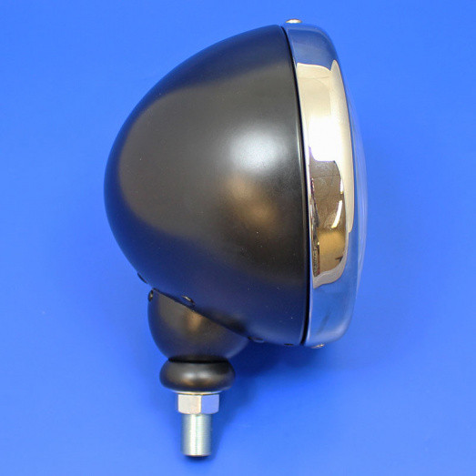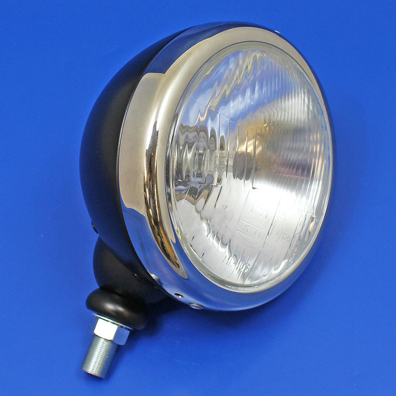 Pair of 5 3/4" Free Standing headlights WITHOUT side lights. Satin black powder coated steel body, ideal for painting body colour if needed, with polished stainless steel rim. Fitted with 5 3/4" round domed headlamp lens, without sidelight.