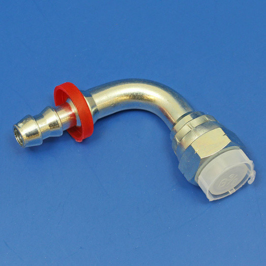 Push on' Steel Oil hose fitting - 90 Deg Swivel Female. For use with R6 hose without the need for additional clips or fastners. Assemble fittings on to hose with Assembly Lube