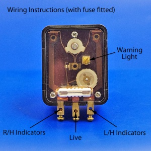 Clockwork panel mounted flasher unit/indicator switch (suitable for 6, 12 or 24 volt systems), makes and breaks contacts for approximately 20-25 seconds then self cancels. Body size approximately 45mm x 55mm x 25mm. Requires 12mm hole in metal panel. Easy to connect input (fused) and exit terminals. This unit is neither voltage or bulb wattage sensitive. PLEASE SEE new part number 414M for a mounting bracket for this switch.