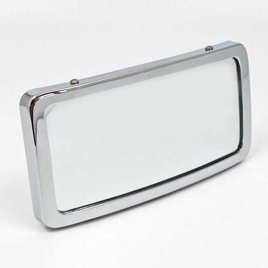 Brass rectangular CONVEX glass mirror. Case 6 1/4" x 3 1/4" (155mm x 80mm) with central rear mounting clamp. Reproduction of a popular style of period mirror produced by Raydyot and Desmo (the very popular Type 36). All brass construction, available in chromium or nickel plated finish, or polished brass. Polished stainless screws to outside of rim.