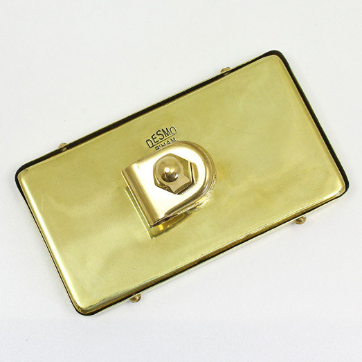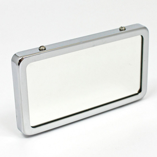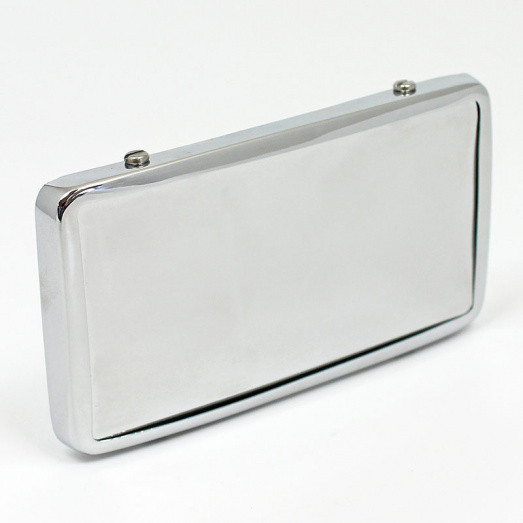 Rectangular, arm mounting mirror, stamped Desmo. Size 118mm x 67mm, fitted with a clamp for 3/8" (10mm) arm. All brass construction, available with polished brass, chromium or nickel plated finish, as well as either flat or convex glass. Please select your preferred configuration from the options below. Handmade in Britain.