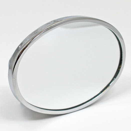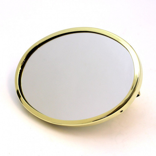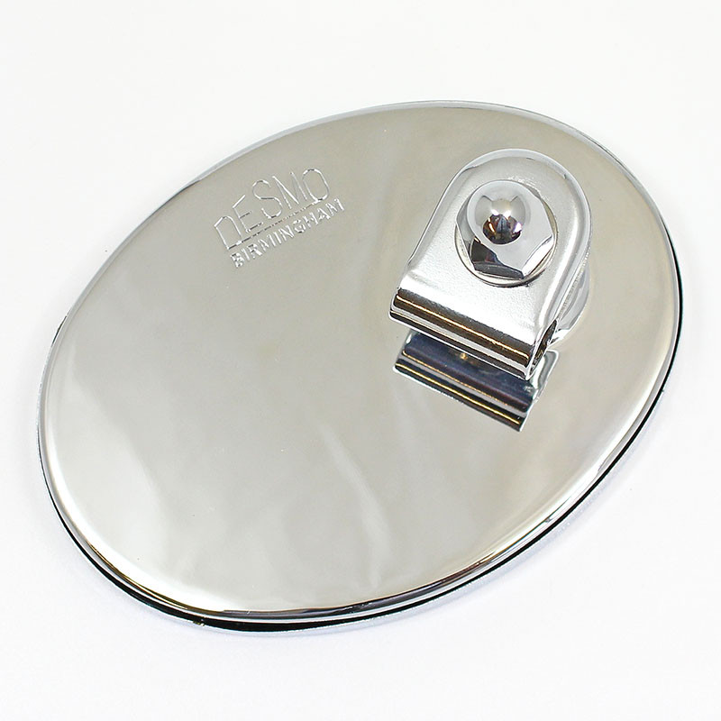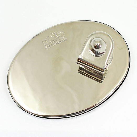 Oval mirror for arm mounting, stamped marked Desmo. Similar in design to the Desmo 217 model. Head size 110mm x 82mm, fitted with a clamp for 3/8" (10mm) diameter arm. Available in polished brass or chromium or nickel plated finish. Convex or Flat glass. Desmo stamped to suit left or right mounting. British made, finished and assembled in our workshops.