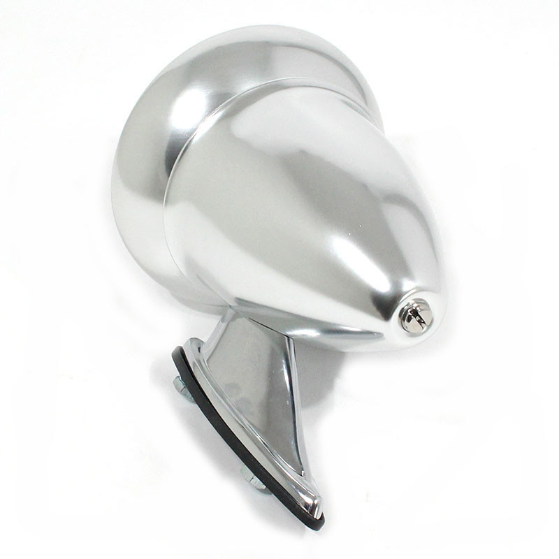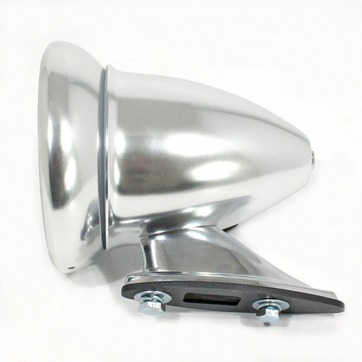 Wing mounted bullet/racing mirror, polished alloy, 4" (100mm) diameter with CONVEX glass. Aerodynamically styled, fully adjustable and vibration free. 110mm long with two bolt base of dimensions 93mm x 27mm with mounting hole centres approx 51mm apart.