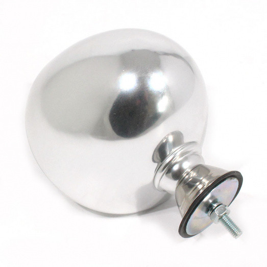 Round lightweight alloy racing mirror. 4" (100mm) diameter, 90mm deep, single stud (6mm diameter x 20mm long) fixing at base. FLAT glass.
