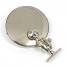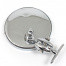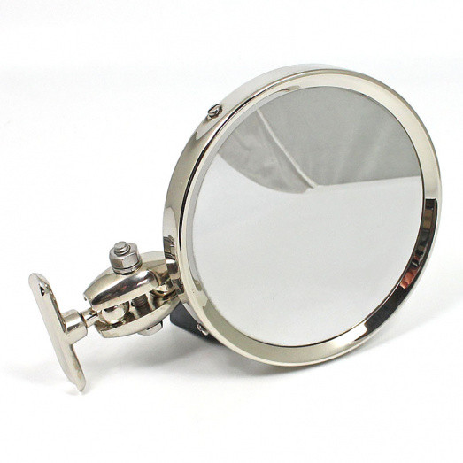 Round mirror, 4 3/4" (120mm) in diameter, stamped 'Desmo' on rear of case. 42mm mounting holes centre to centre. Supplied with convex or flat glass . Fitted with the universally adjustable bracket used on many period mirrors. Cast bracket arm onto mirror allows further fine adjustment with a dome into cup arrangement. The bracket is secured with a domed nut. All brass construction, available in chromium or nickel. The head of this handmade British mirror is very similar to the original Lucas 140 model, with a the twin ball joint arrangement allowing improved adjustment.