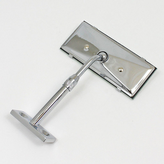 Dash mirror on adjustable height stem, as fitted to the Jaguar XK140. Fixed, rectangular two screw base size 51mm x 21mm with mounting holes at 31mm centres, angled away from the screen. Metal backed FLAT glass with ball pivot in rear of casing. Mirror head 105mm x 45mm. Stem height adjusts from min 80mm to max 150mm high. All chrome finish.