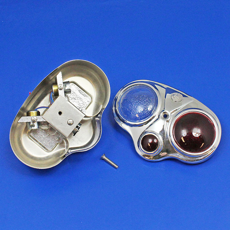 A super reproduction of the "Owl Eye" rear lamp from Toby - originally for 'stop', tail and reversing function. A quality recreation of the original Lucas type 312B lamp. All brass pressings, supplied in Chrome or Brass with red and clear or red and amber main diffused pattern lenses - please select required lens combination from the 'Drop Down' option box. Number plate illumination on underside. Size approx. 152mm wide x 105mm tall x 65mm deep.