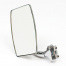 Quarterlight clamp on stainless steel mirror. FLAT glass 115mm x 70mm with stainless steel back mounted on a curved arm. Arm extends out 55mm from mounting screws and then 65mm up to the centre of the mirror head. Two grub screws nip the assembly to the edge of the opening quarterlight. Universal mirror that will fit on either the left or right hand side of the vehicle.