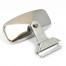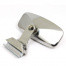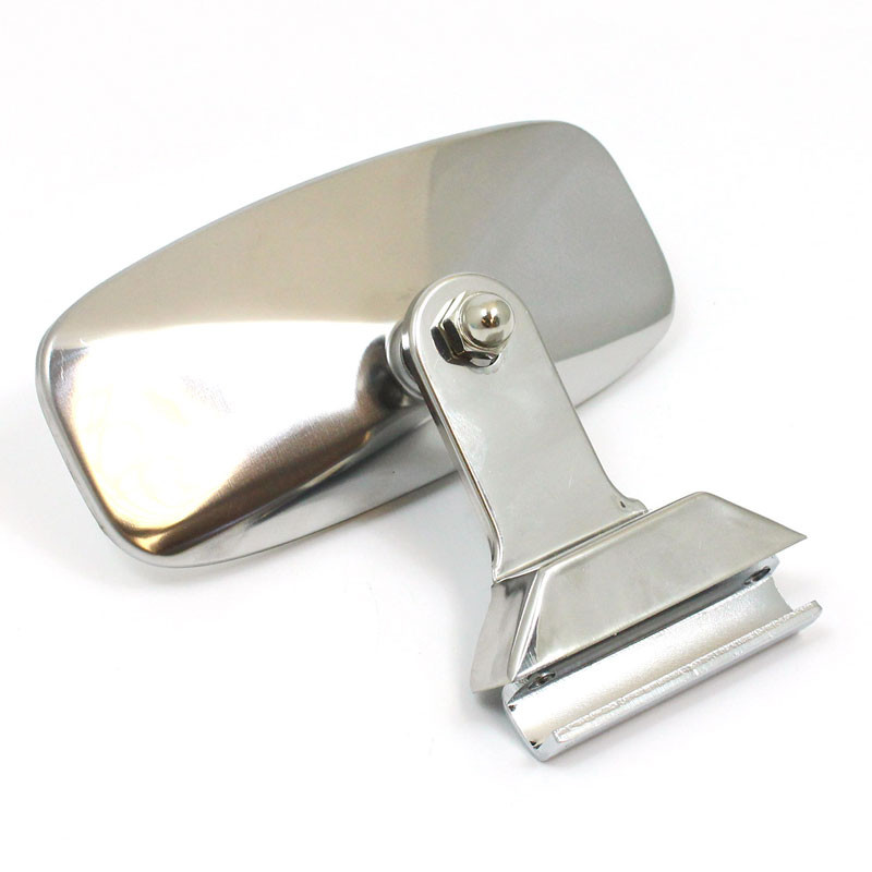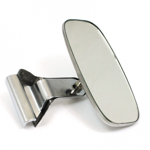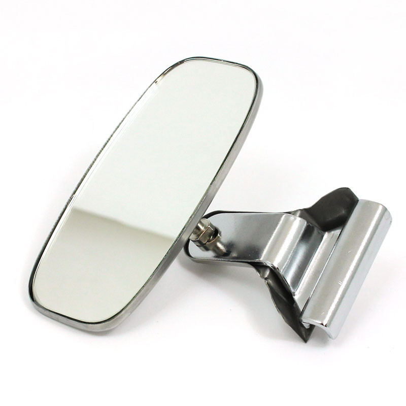 Quarterlight glass type clamp on stainless steel mirror. CONVEX glass 115mm x 73mm, with stainless steel mirror back and straight bracket. Two screws nip the assembly to the edge of the opening quarterlight, to suit either the right hand or left hand side.