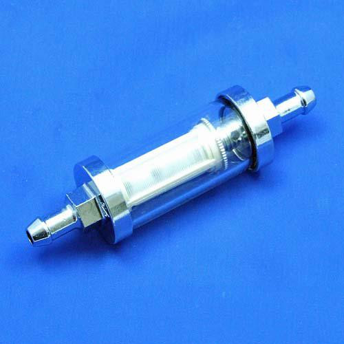 Toughened glass body in line fuel filter, body approx 28mm diameter x 77mm long overall (pipe tails in addition). The ends can be unscrewed and taken apart for washing out or changing the filter liner as necessary. 40 micron nylon mesh filter screen. Use on low pressure systems - max 10psi. Also available in MICRO size - 40mm long, excluding pipe tails.