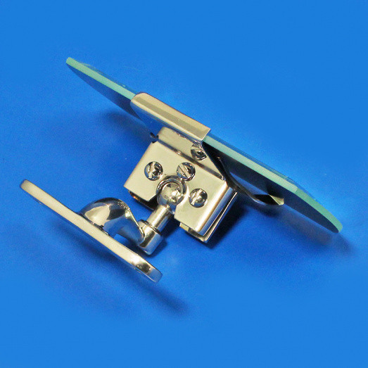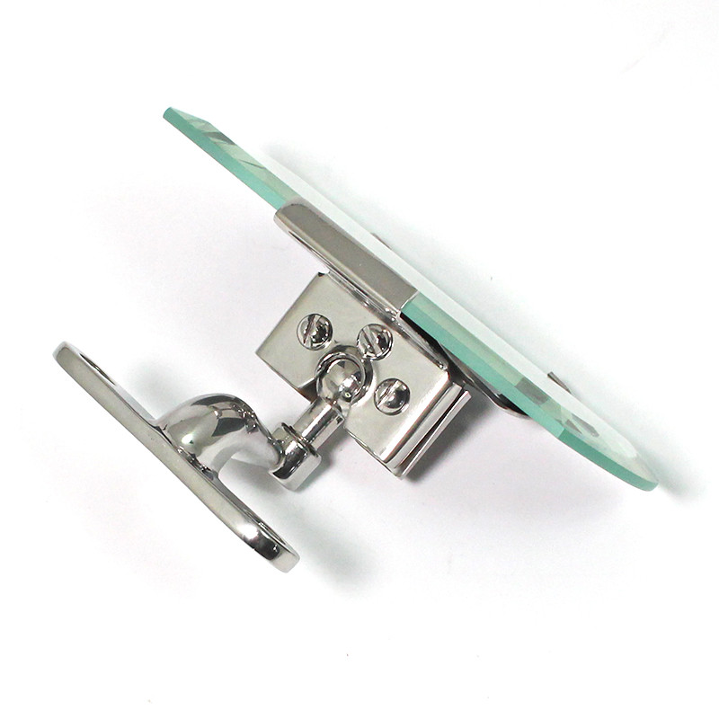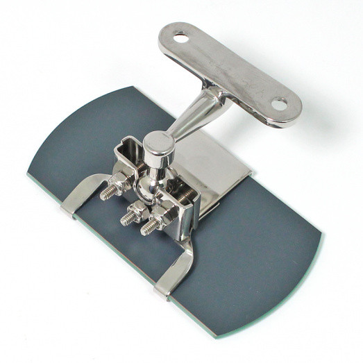 A nice, neat FLAT glass vintage interior mirror with shaped glass with a bevel edge. Glass size 126mm x 65mm. The glass is held at the top and bottom with a traditional stainless steel clamp which tightens with three screws onto the adjustable ball of the polished stainless steel mounting arm - 50mm tall (top to centre) x 68mm wide, with 50mm mounting hole centres.