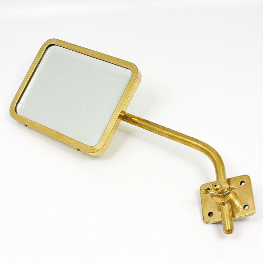 Heavy veteran or Edwardian pattern mirror of a style traditionally manufactured by Toby. Flat mirror glass with bevel edge and heavy rim and backing. Head dimensions 172mm x 135mm. Substantial arm approx 270mm long with very secure mounting base plate 50mm x 63mm. This item is offered in polished brass or with nickel plated finish at additional cost and by special order. The mirror head is hand made in our workshops, the base components lost wax cast with the whole assembly finished by ourselves.