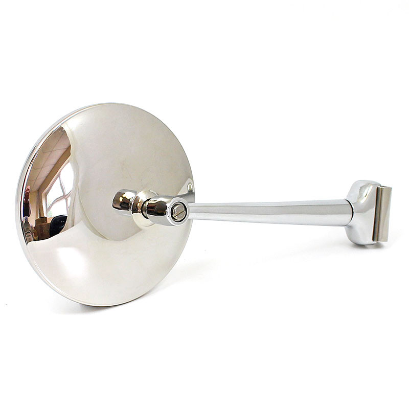 Chrome finish, clamp to door frame edge, stainless steel exterior mirror. FLAT glass head 112mm diameter, on an arm approx 135mm long. Adjustment to mirror head angle is achieved by slackening a screw in the arm. The base measures approx. 36mm high x 19mm wide and will grip on to max. thickness of 5mm. Please note that the grub screw base is itself held on the chrome arm base with another screw.