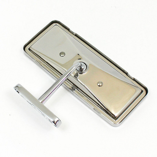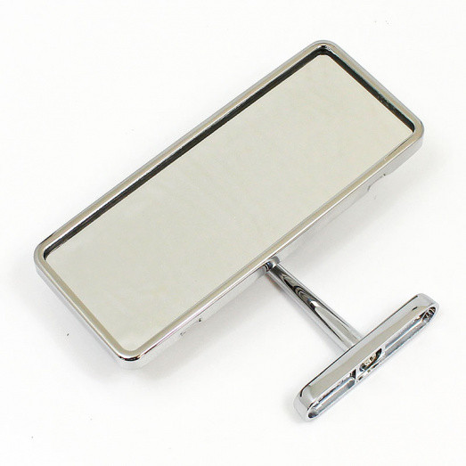 Interior rear view mirror with stainless steel head and chrome stem as fitted to MGA etc. FLAT glass, head size approx 130mm x 57mm, with stainless steel outer edge protection. Mounting stem base 58mm x 14mm with two mounting holes at 40mm centres. Maximum overall height fitted 93mm. Adjustable ball socket in back of mirror case.