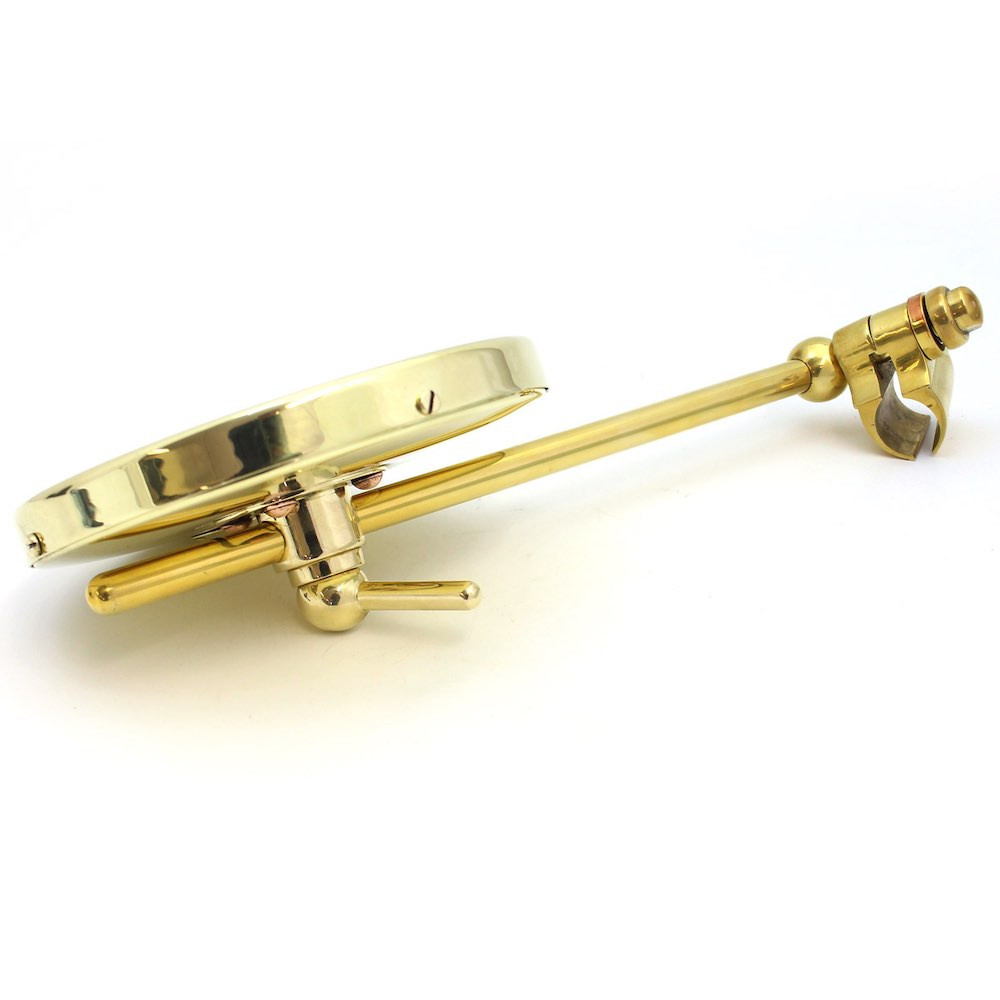 British-made, all brass construction, with investment cast bracket fittings, spun brass head, riveted rear fixing and attractive all-brass clamp assembly. This period mirror design is available in polished brass or nickel-plated finish with a rivetted TOBY medallion badge on the back.