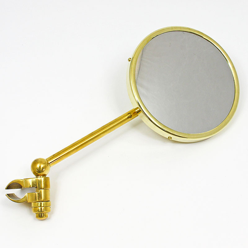 A large circular rear view mirror 5 1/2" (140mm) in diameter. A splendid reproduction of a large windscreen pillar mounted, early motoring mirror. Fitted with a convex glass lens the unit can be adjusted for length. Suitable for most medium to large-sized vehicles. Arm 10mm diameter, length approx 250mm. Clamps on to approx. 22mm diameter rod.