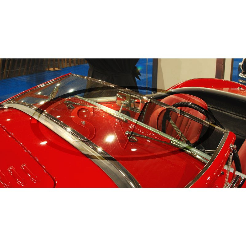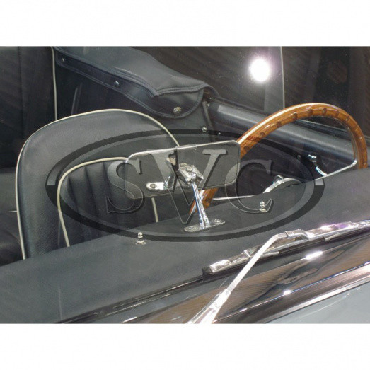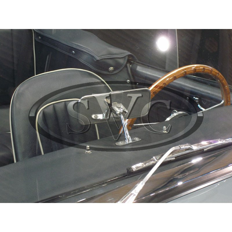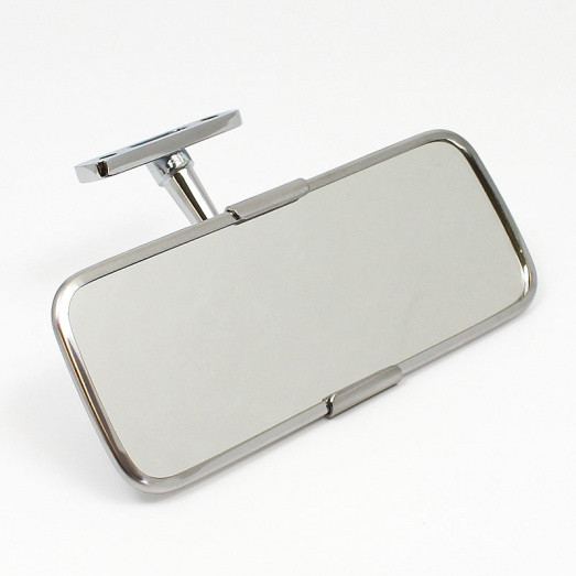 Interior FLAT glass mirror on stalk. Stainless steel rim and backing with chrome plated mounting. Large head size 154mm x 62mm, overall height approx 95mm. Base 58mm x 16.5mm with 38mm mounting hole centres. Traditional pressed stainless steel adjustable clamp. Please note a protective plastic film needs to be removed from the face of the glass before use.