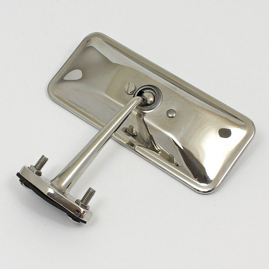 Interior rear view mirror with polished stainless steel back with adjusting ball socket. FLAT glass. Large 172mm x 62mm mirror head. Mounting arm approx 85mm high. Approx 105mm overall mirror height. Two mounting holes at 36mm centres. Base dimensions 50mm x 25mm. The mounting arm leans away from screen/is angled on the base.