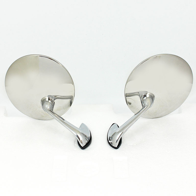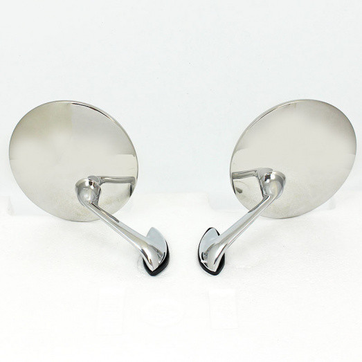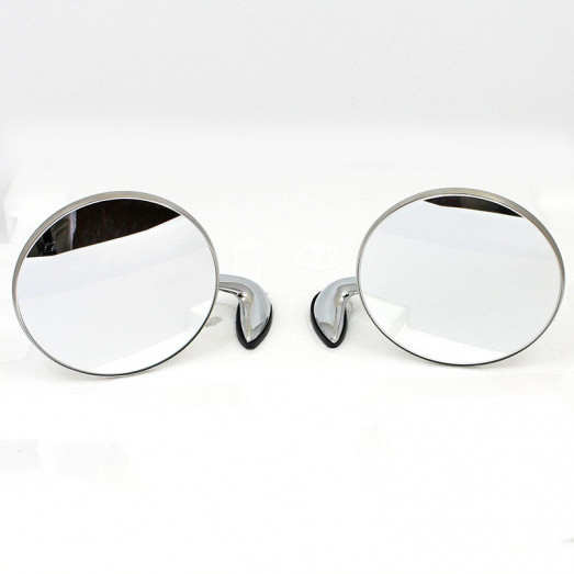A pair of 1950's style chromed wing mirrors. Round mirror head on curved arm for mounting on to the wing or door. A single M8 mounting bolt, requiring an 8mm clearance hole in the panel, on shaped base of dimensions 58mm x 18mm. The chrome arm slopes out and toward the rear. Polished stainless mirror head with CONVEX glass approx 112mm diameter. Supplied complete with rubber base gaskets. Offered in PAIRS only.