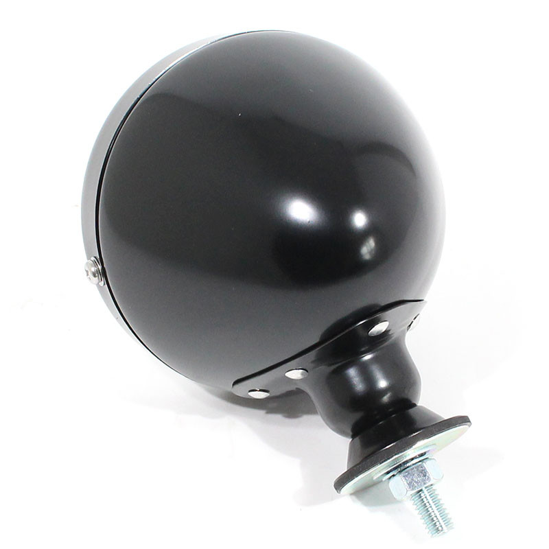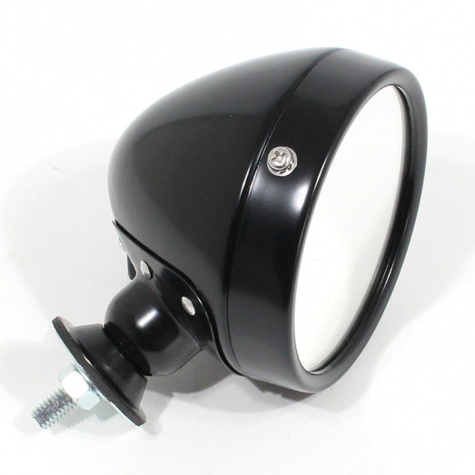 A lightweight BLACK coated, alloy racing mirror. A reproduction of the Raydyot "Grand Prix" style model, popular on Cobras and many racing cars. The FLAT mirror glass is approx 3 1/2" (90mm) diameter. The mirror body is approximately 102mm diameter, with the shell approximately 78mm front to back. The base is 40mm diameter and fitted with an M6 stud, nut and washer.