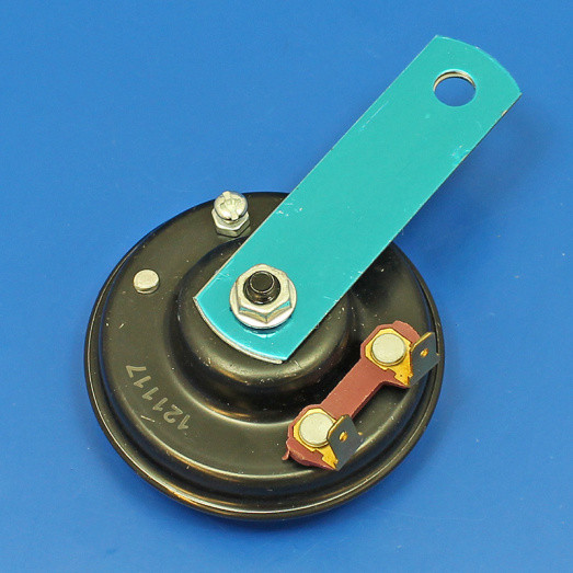 High quality 12 volt all black disc horn. 75mm diameter with mounting bracket and 8mm clearance hole.This horn has two terminals so the body of the horn is insulated, making it suitable for 12 volt positive or negative earth systems. High note. A top quality âEâ marked horn