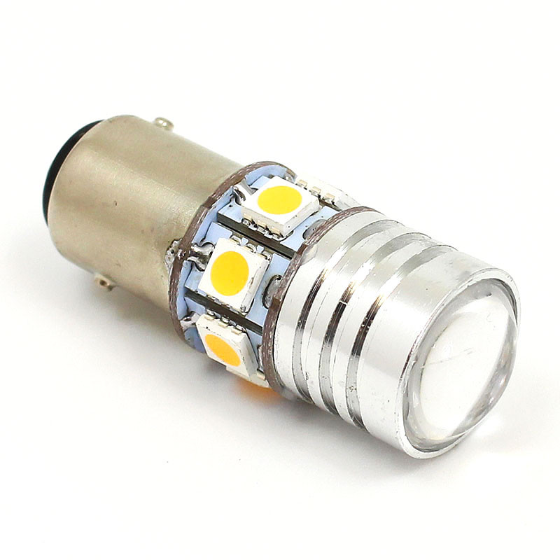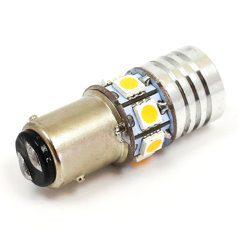 7 x 5050 SMD Warm White LED and 2 x High Power CREE LED combined Number Plate Illumination and Stop and Tail lamp. Multi direction bulb with 6 Volt application with offset pin BAY15D base and integral lens. 3000k warm white 360 degree light and bright RED colour temperature from 2 x Cree LEDs behind a lens.