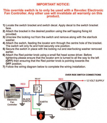 3 Way rotary switch for use with a Revotec Fan Controller enabling the fan to be manually controlled either On, Off or Automatic. Perfect for 4X4 applications such as wading. Supplied with black anodised mounting bracket kit. Position decal. Sealed 3m wiring loom and connection diagram. This product must be used with a Revotec Electronic Fan Controller.