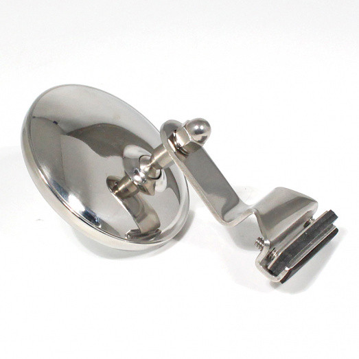 Small circular clamp-on mirror. Stainless steel bracket and mirror back. 78mm diameter FLAT glass. Can be fitted without drilling, to either the quarterlight frame, or quarterlight glass pillar gutter. Supplied with all fittings.