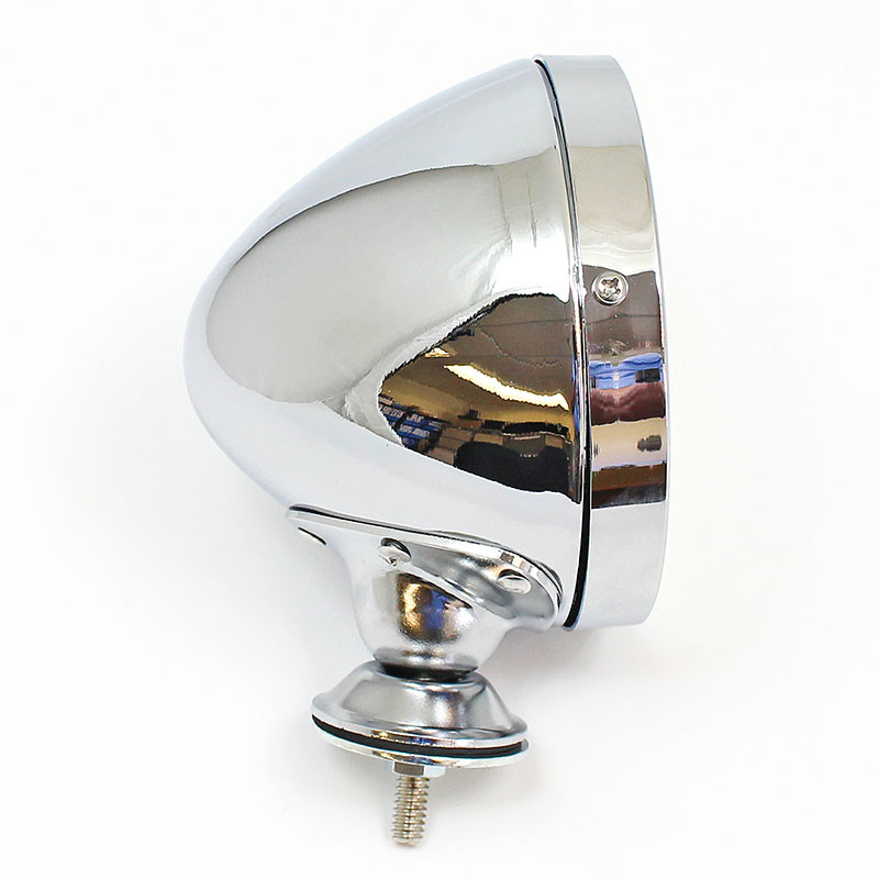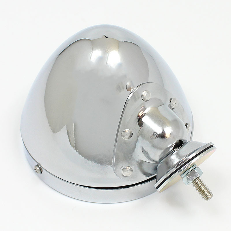 Chromed alloy racing/bullet mirror. A reproduction of the Raydyot "Grand Prix" style model, popular on Cobras and many racing cars. The FLAT mirror glass is approx 3 1/2" (90mm) diameter. The mirror body is approximately 4" (102mm) diameter and 78mm front to back, the base 40mm in diameter and fitted with an M6 stud, nut and washer.