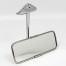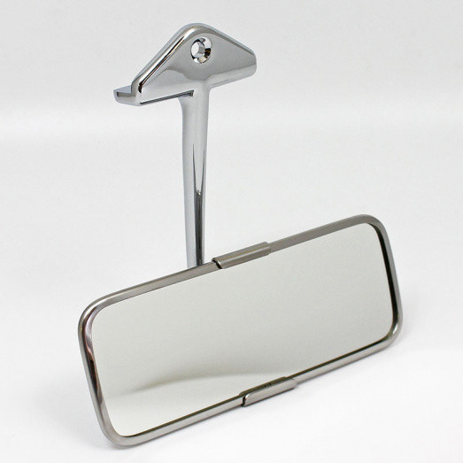Polished stainless steel backed interior mirror which clamps to windscreen surround with a substantial chrome on brass swan neck bracket with stepped attachment fitting, original application early mini. Mirror head 155mm x 61mm with flat glass. Ball on swan neck bracket fits into traditional pressed stainless steel clamp brackets. 110mm from the bottom mounting face to the neck ball.