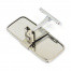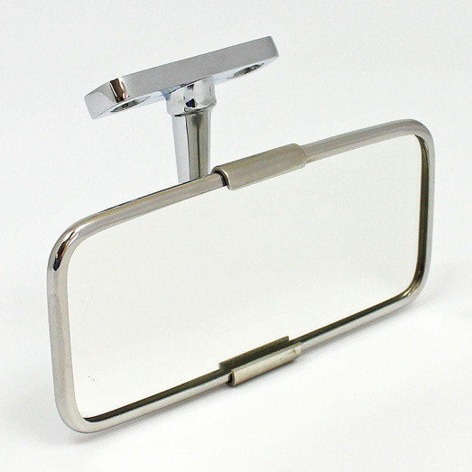 Polished stainless steel interior rear view mirror. Mirror head 128mm x 56mm with stainless steel backing and edge rim. Mounting arm 44mm long with a 58mm x 16mm mounting pad, hole centres at 40mm, ball held by traditional mirror clamp bracket, overall depth 36mm.