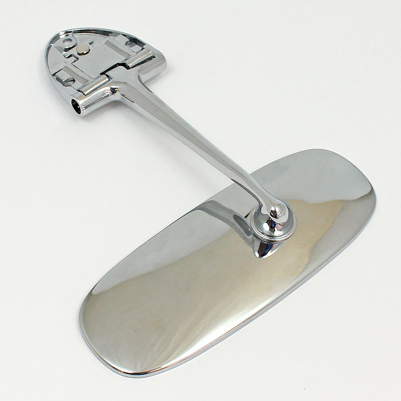 Polished stainless steel FLAT glass interior mirror with a chrome offset arm, originally early VW applications including Beetle '58 - '64. Mirror head measures 155mm x 60mm, mounting arm is 175mm tall with a 'shield' shaped mounting bracket, 54mm wide x 63mm tall, with three 5mm mounting holes. The bracket incorporates a clamping plate. The arm offset is to the right of the mirror head, distance from each edge to centre of arm - long 95mm, short 60mm.
