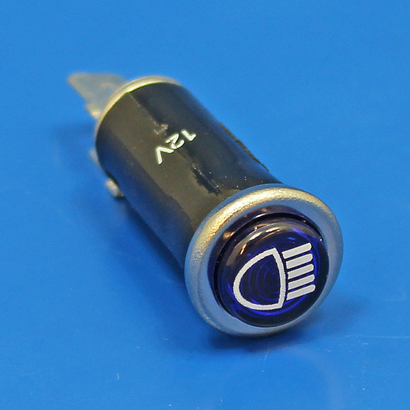 Chrome rimmed panel warning light, blue main beam. Rim diameter 16mm approx, hole required 12.5mm approx. Fitted with BA7S bulb holder and 12V 2W bulb as standard. 6.3mm push on spade/Lucar rear terminal connections. For replacement/alternative bulbs, please order B282B (6V), B281B (12V) or B283B (24V)