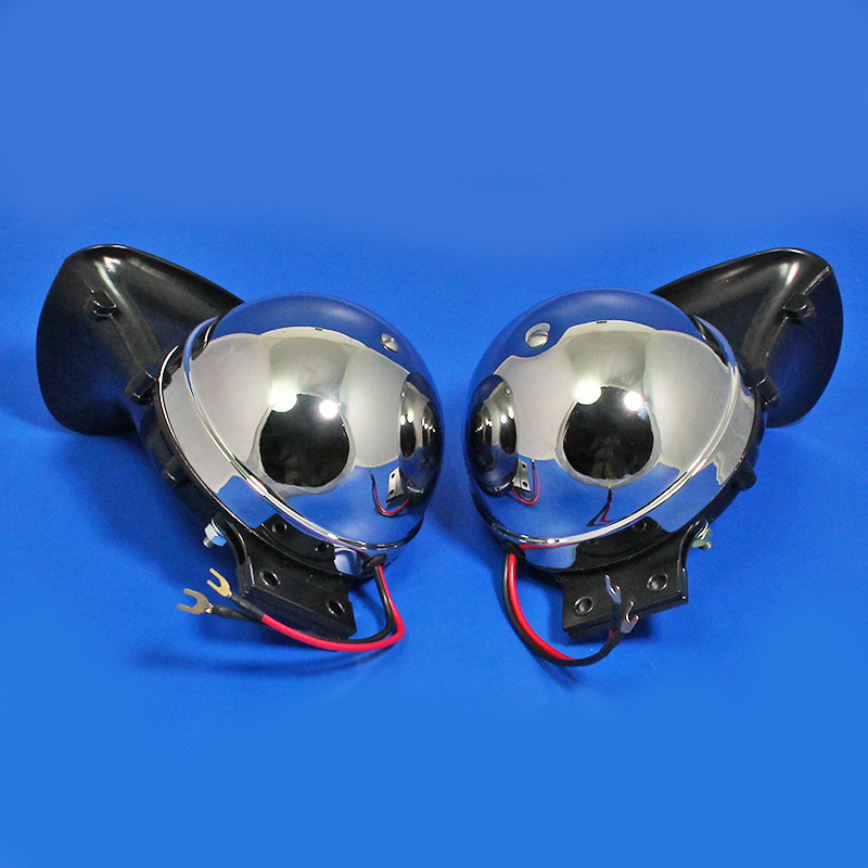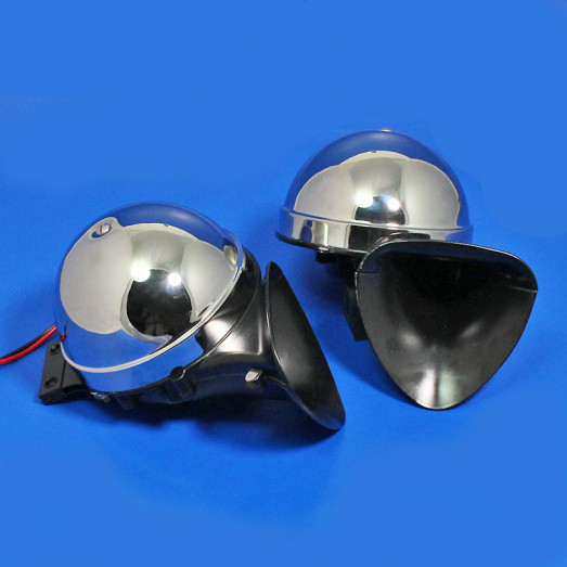 Pair of Windtone horns with chrome on brass dome giving high and low notes. This type of horn set was fitted to many British cars of the 1940s and 1950s, and provides a robust but musical ''hoot''. A quality reproduction of the original Lucas WT618, under bonnet model of the wind tone horn. Compact, lightweight with a Chrome Dome & Black body finish.